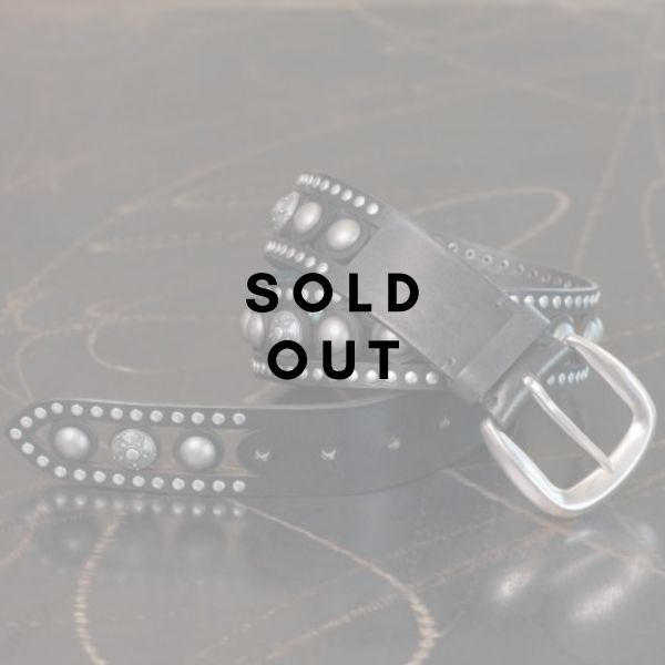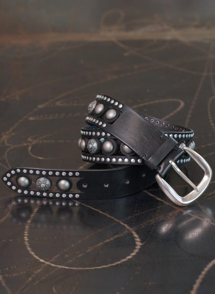 Accessorio versatile e grintoso allo stesso tempo, questa cintura è caratterizzata da borchie in argento invecchiato e da una fibbia leggermente arrotondata.