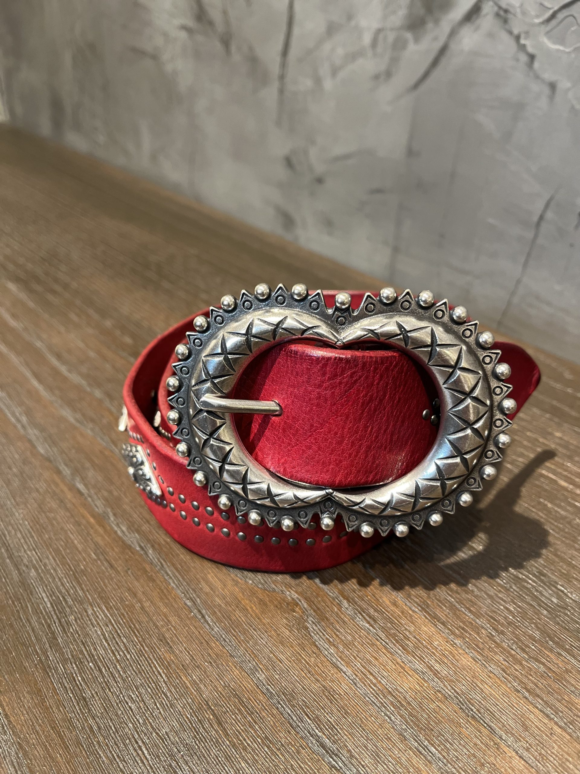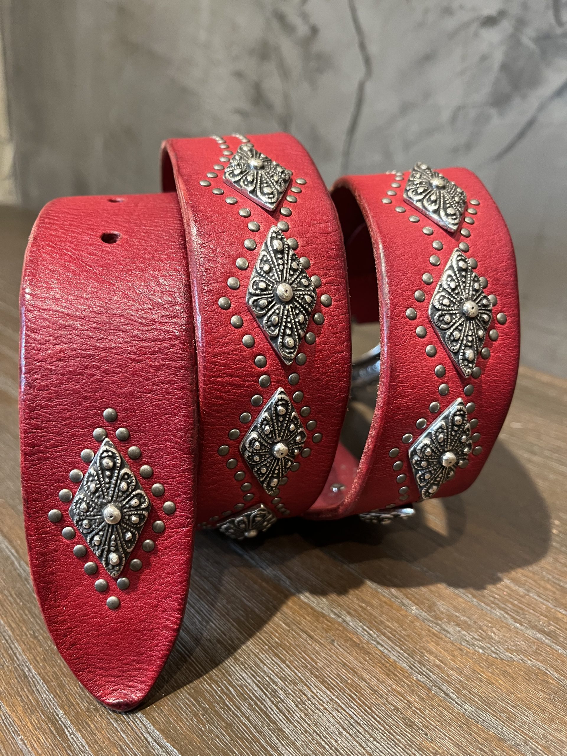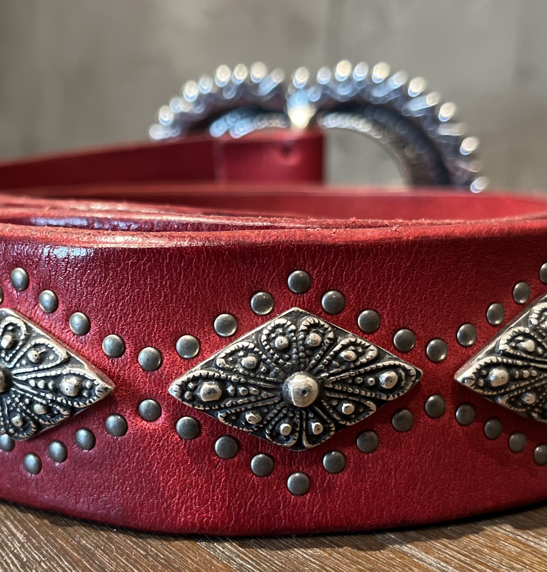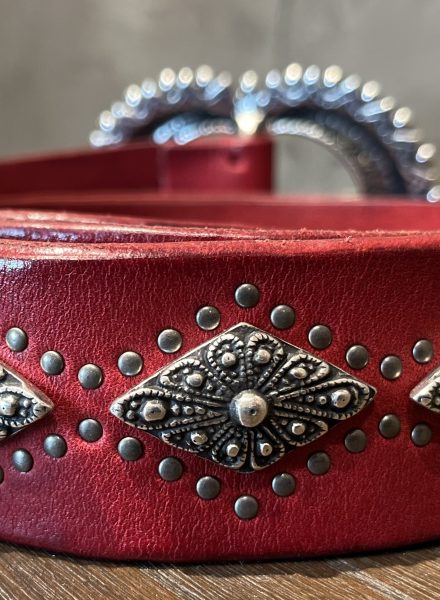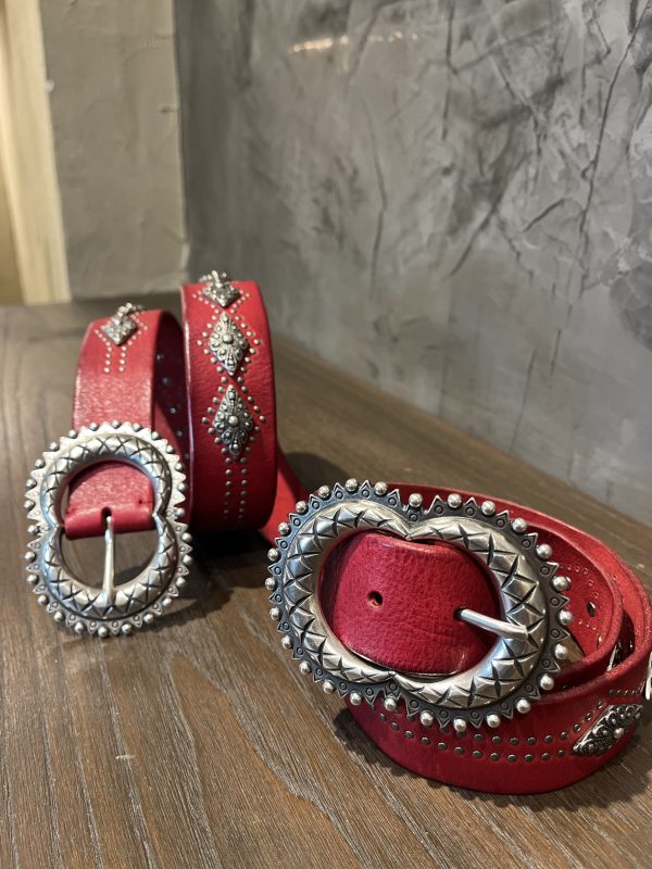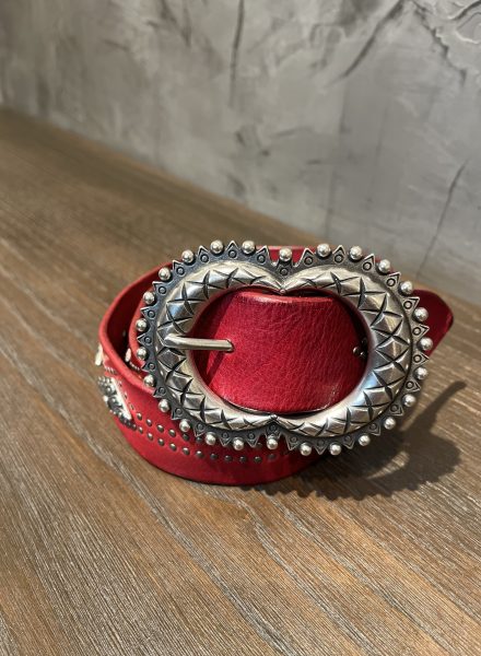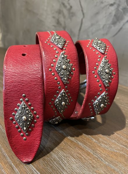 Accessorio versatile e grintoso, questa cintura è caratterizzata da borchie in argento vecchio che compongono un disegno distintivo.