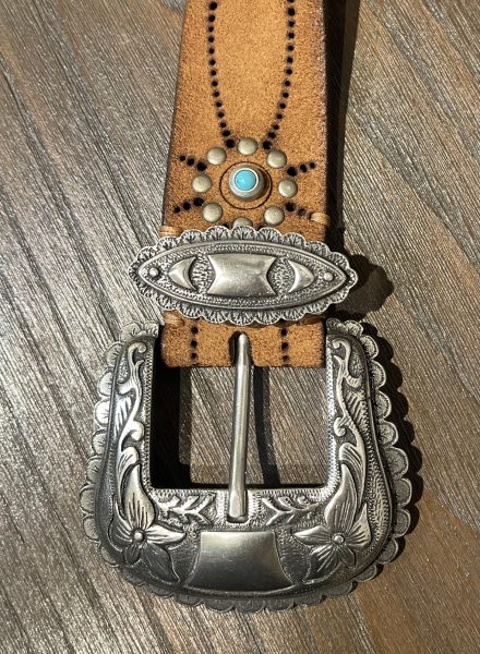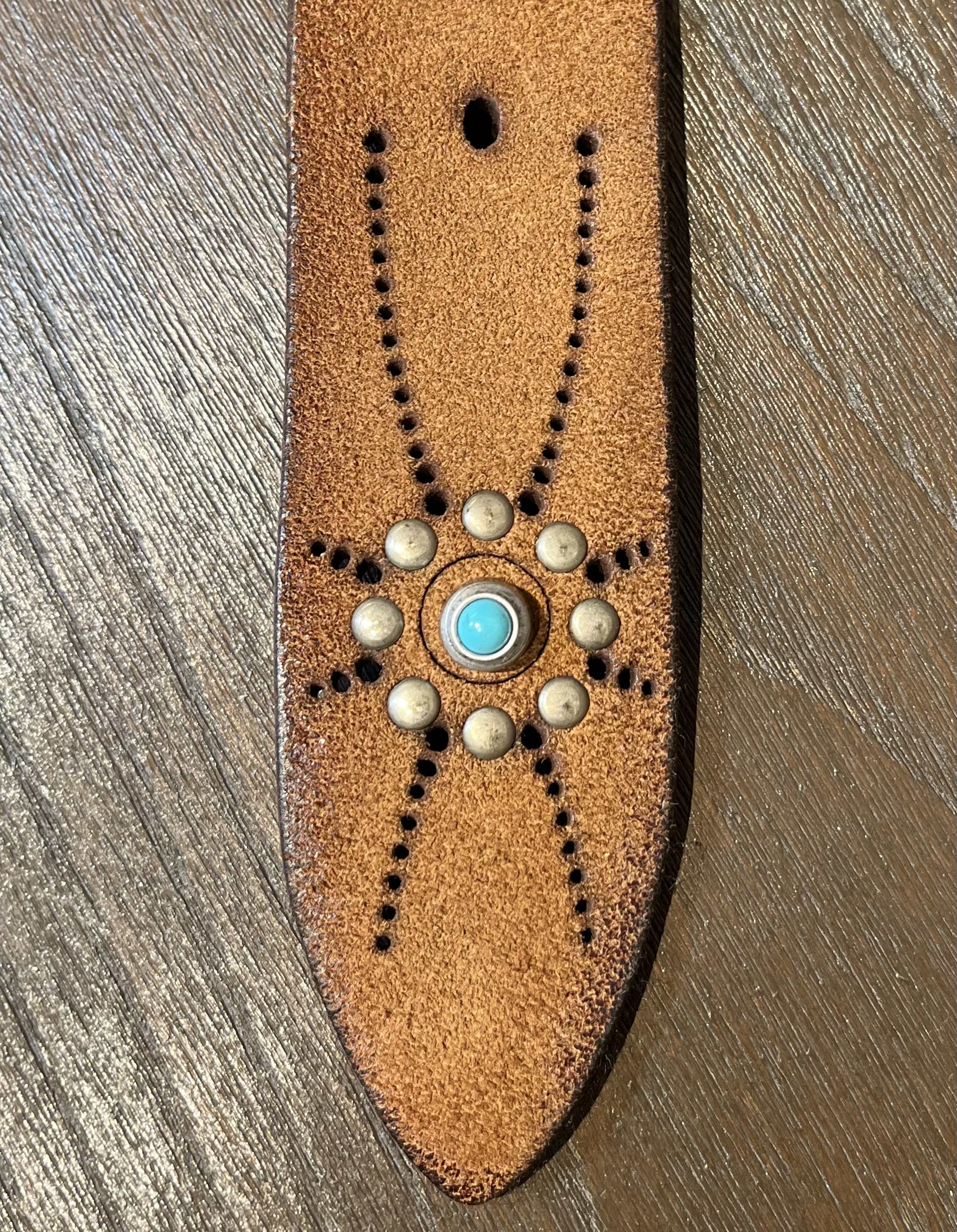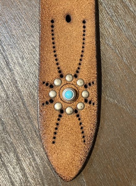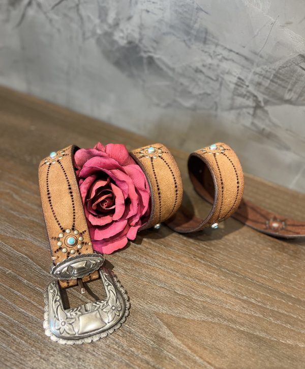 Accessorio dal gusto western, questa cintura è impreziosita dalle borchie e dai motivi che quest’ultime creano insieme agli intagli fatti a mano.